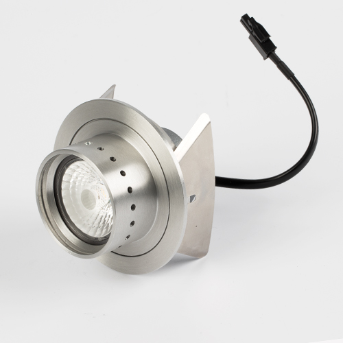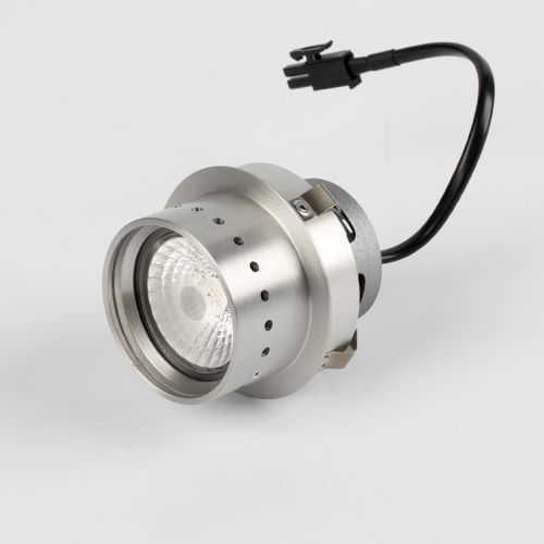 Diese Leuchte erzeugt zusammen mit einem Basisring eine Halbeinbauleuchte, die nur 29mm vorsteht und eine maximale Einbautiefe von 44mm benötigt. Und dabei kann sie immer noch ein gerichtetes, gut ausgeblendetes Licht erzeugen. Sie kann variabel bestückt werden, mit den Fassungen GU10 oder GU5.3 und vor allem auch mit den LED Modulen (LED Engine).