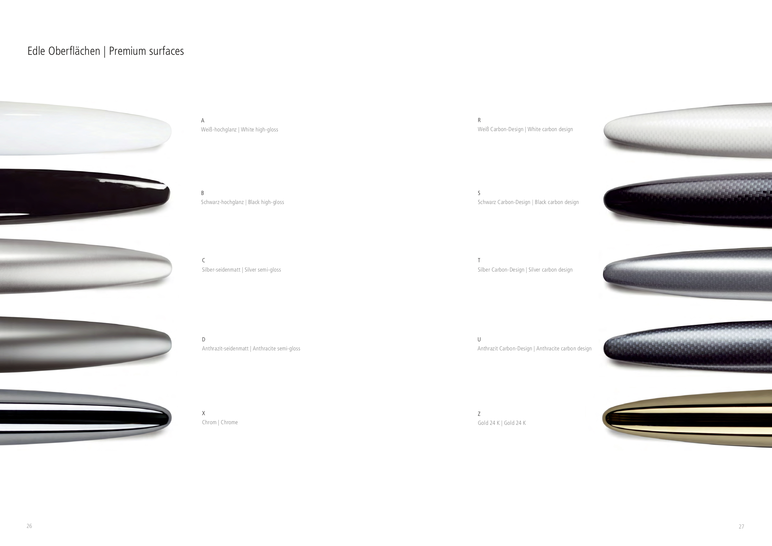 - Gehäusefarben: Weiss hochglanz / Schwarz hochglanz / Silber seidenmatt / Anthrazit seidenmatt / Ferrari rot / Weiss Carbon-Design / Silber Carbon-Design / Schwarz Carbon-Design / Anthrazit Carbon-Design / Chrom / Vergoldet 24K